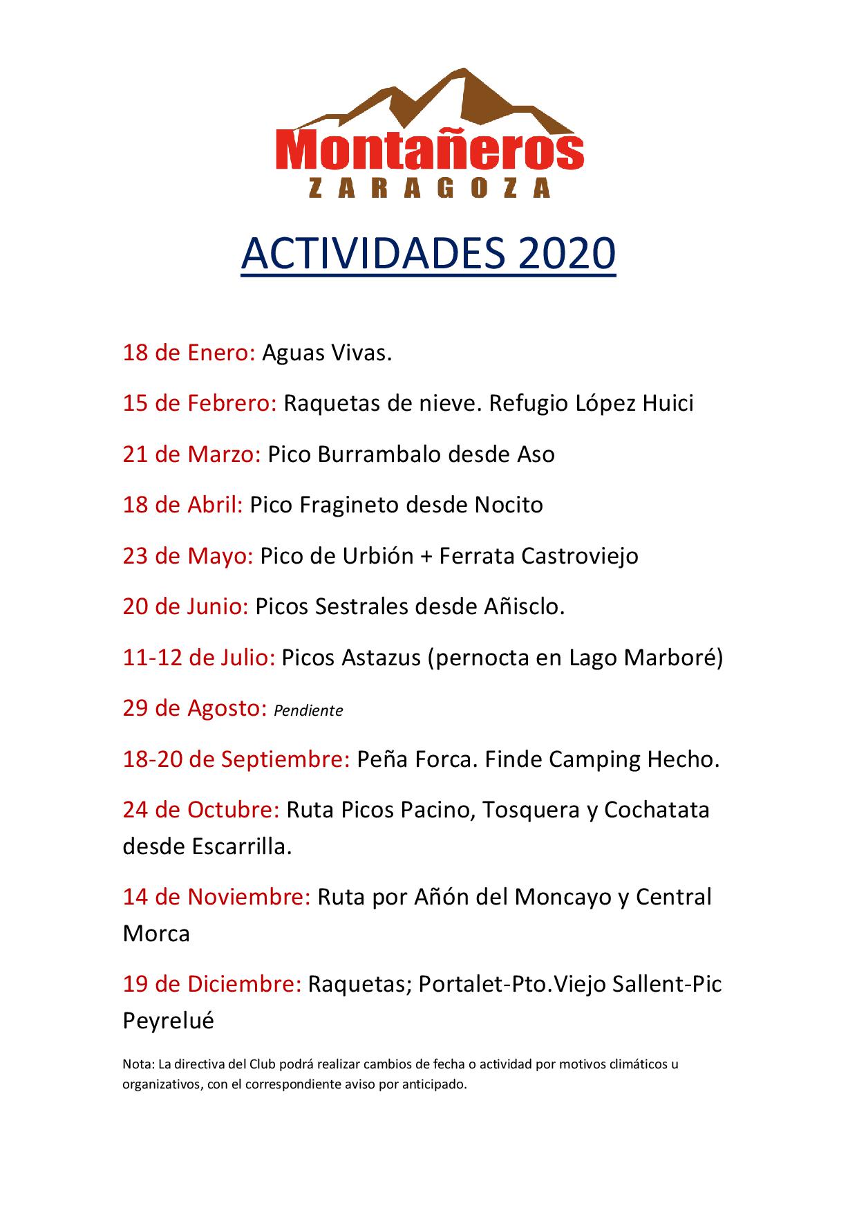 Calendario de Actividades en 2020, según aprobado en Junta Anual Ordinaria.