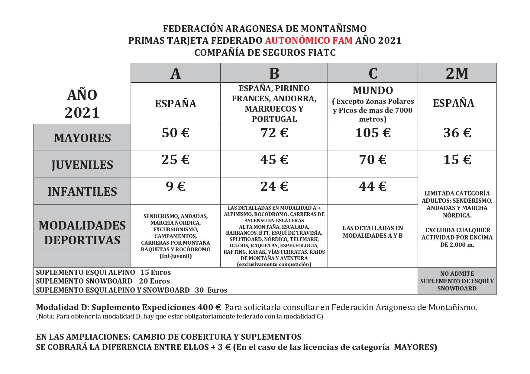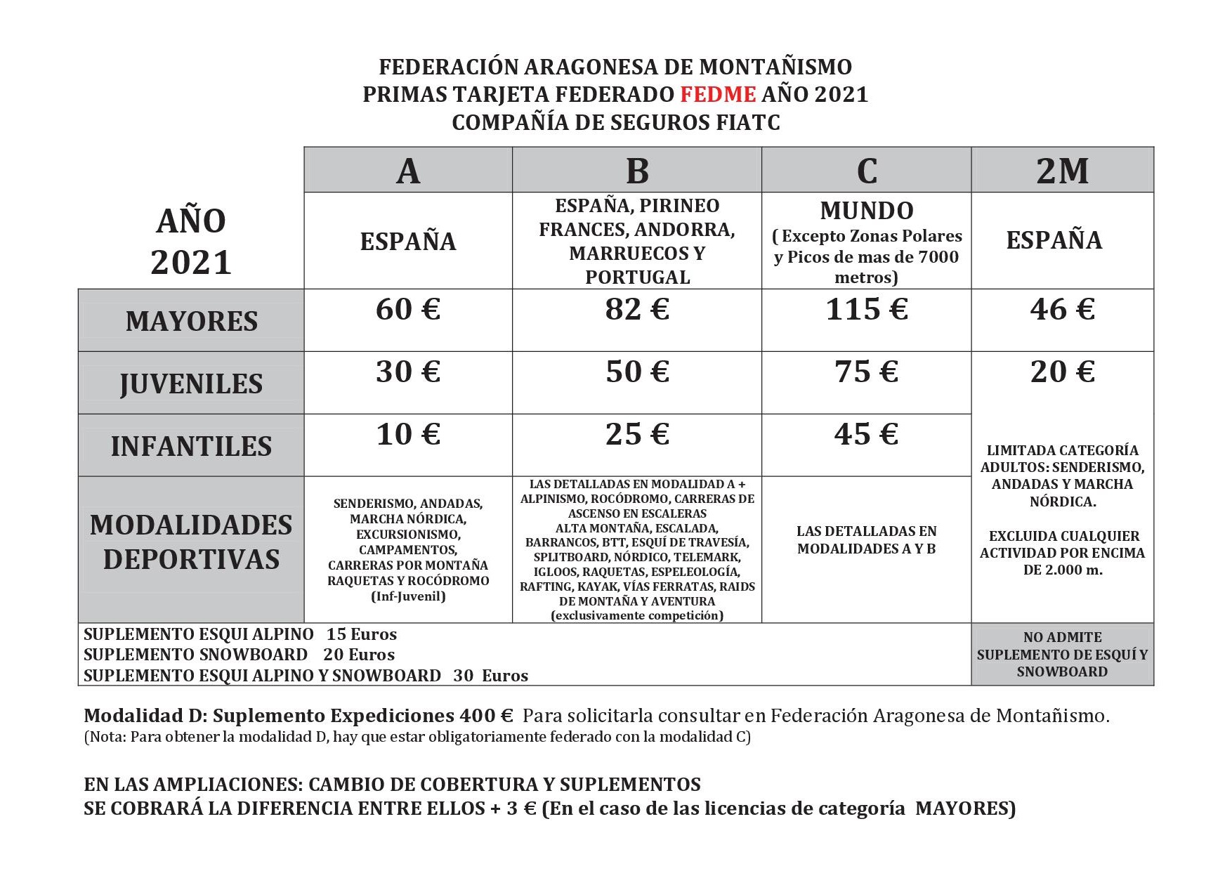 A continuación se presentan las tablas de precios de las 2 tarjetas federativas posibles.